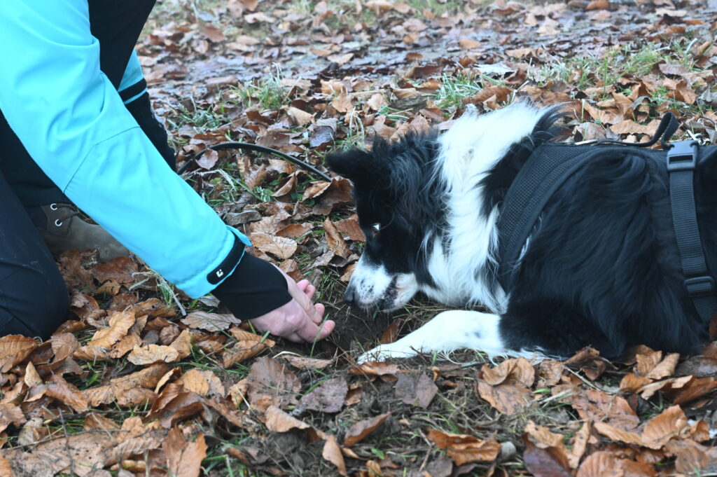 Ihre zehnjährige Hündin Chai ist bereits eine sehr erfahrene Sucherin. Dies merkt man auch daran, dass sie sehr konzentriert schnüffelt. Auf ein Suchsignal, ein kurzes «go!», beschnuppert sie den Waldboden und beginnt bald darauf an einer Stelle zu graben. Ein Wort genügt und die Hündin stoppt, sodass Aschwanden nur noch den Trüffel aus dem Loch heben muss. Wenn man nicht schnell genug sei, würden weniger trainierte Hunde laut Aschwanden die Trüffel sofort fressen.