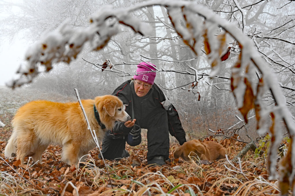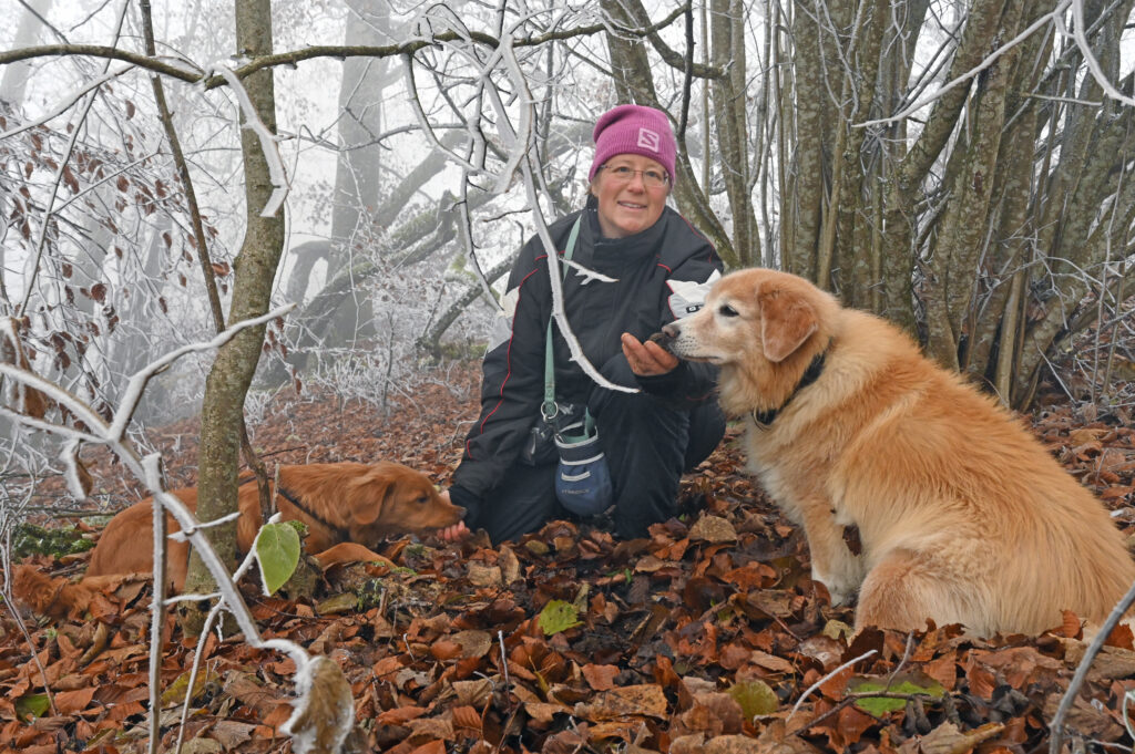 Die Verhaltensbiologin Sibylle Aschwanden sucht mit ihren Hunden Chai und Bailey nach schwarzen Burgundertrüffel. Sie bildet auch andere Hundehalterinnen und -halter für die Suche aus – bei einem Kursbesuch kommen knapp 220 Gramm der Knollen zusammen.