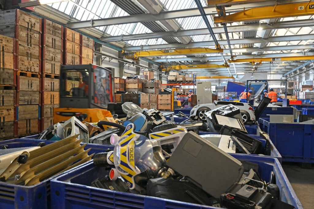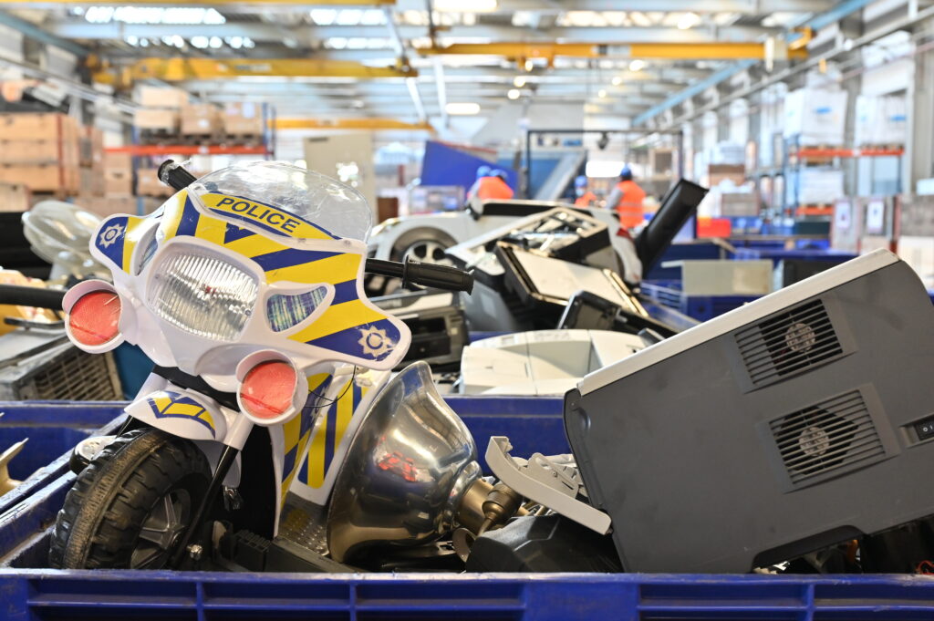 Auf dem Band liegt ein Waffeleisen, daneben ein elektrisches Kinderauto. Hier werden die Gehäuse von Wertstoffen getrennt; komplett in Handarbeit, erklärt Ryf.