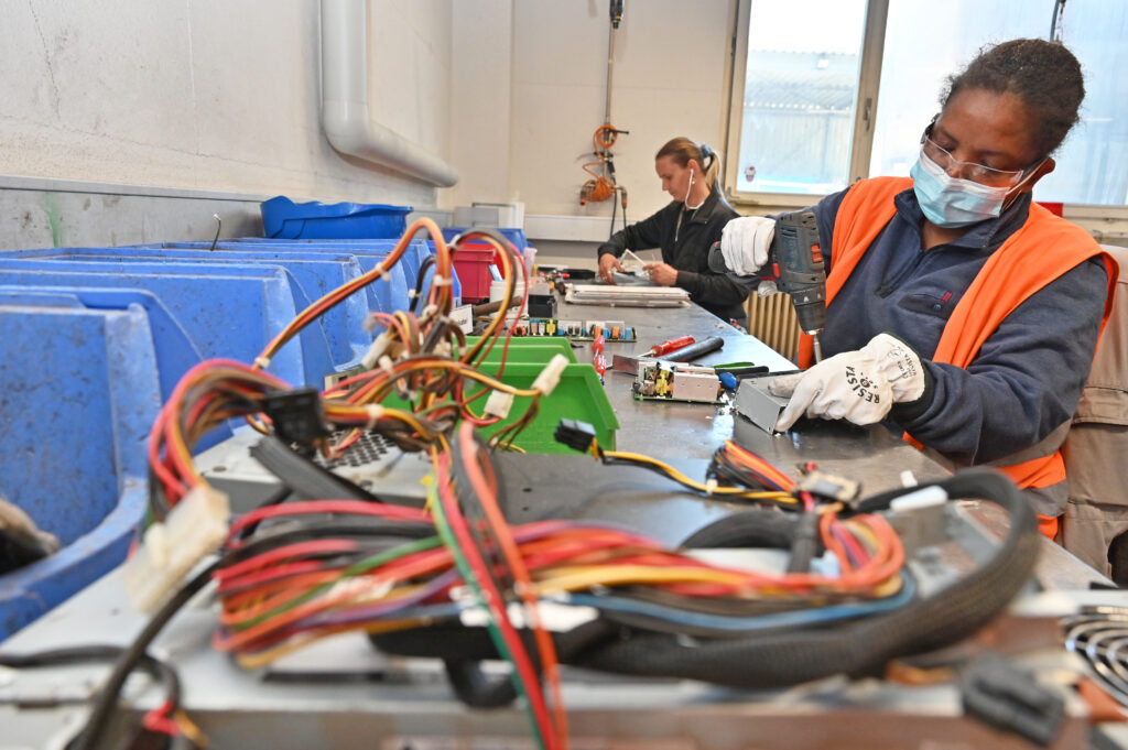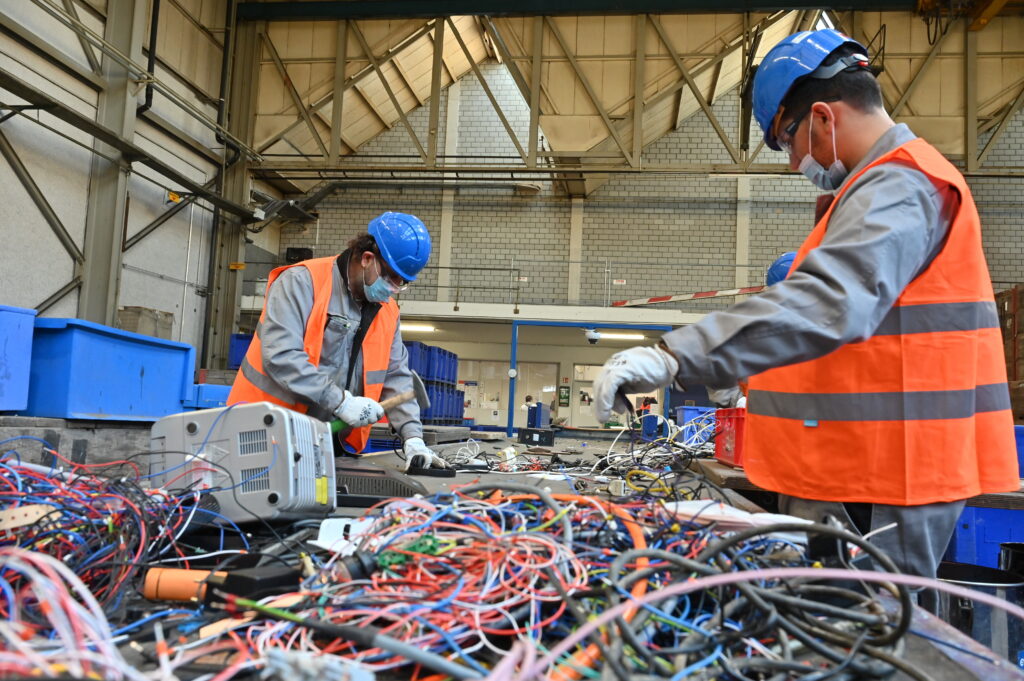 Beschäftigte der Bildungswerkstätte Oltech schneiden an einem Fliessband die Kabel von elektrischen Kleingeräten ab und bauen Akkus, Kondensatoren oder Transformatoren aus.