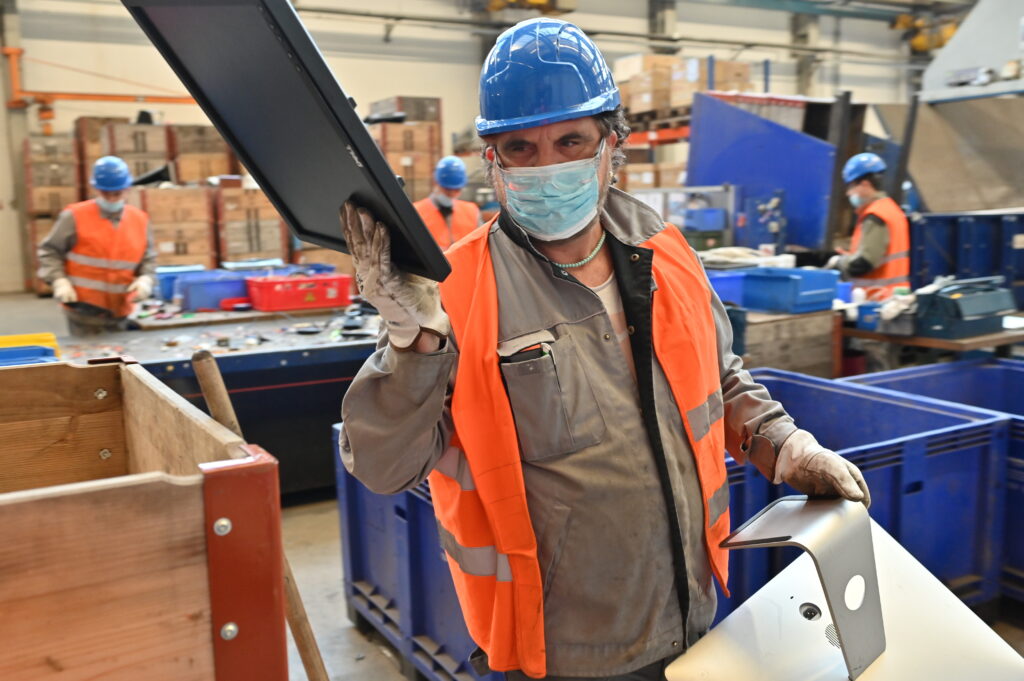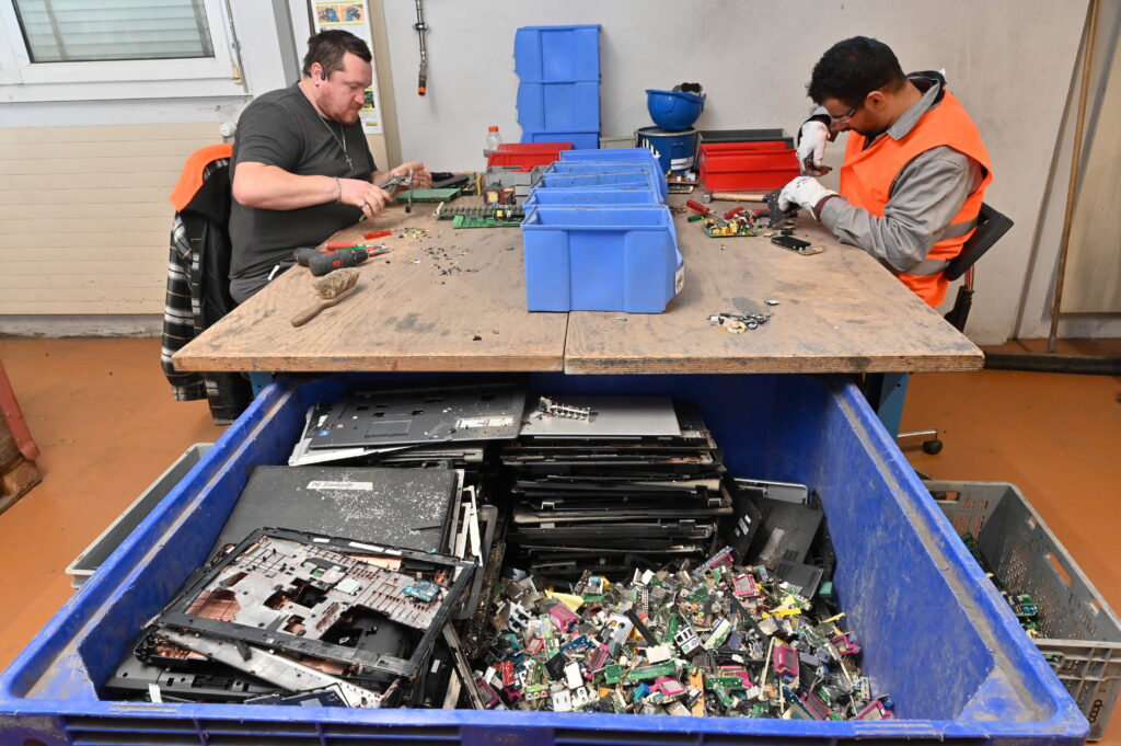Die Arbeiterinnen und Arbeiter schrauben oder brechen die PCs und Laptops auseinander. Anschliessend werden die Materialien wie Aluminium, Stahl, und Plastik sortiert. Laufwerke, Prozessoren, Leiter- und Festplatten werden gesondert in Boxen gesammelt. Die Akkus landen erneut im Spezialgefäss.