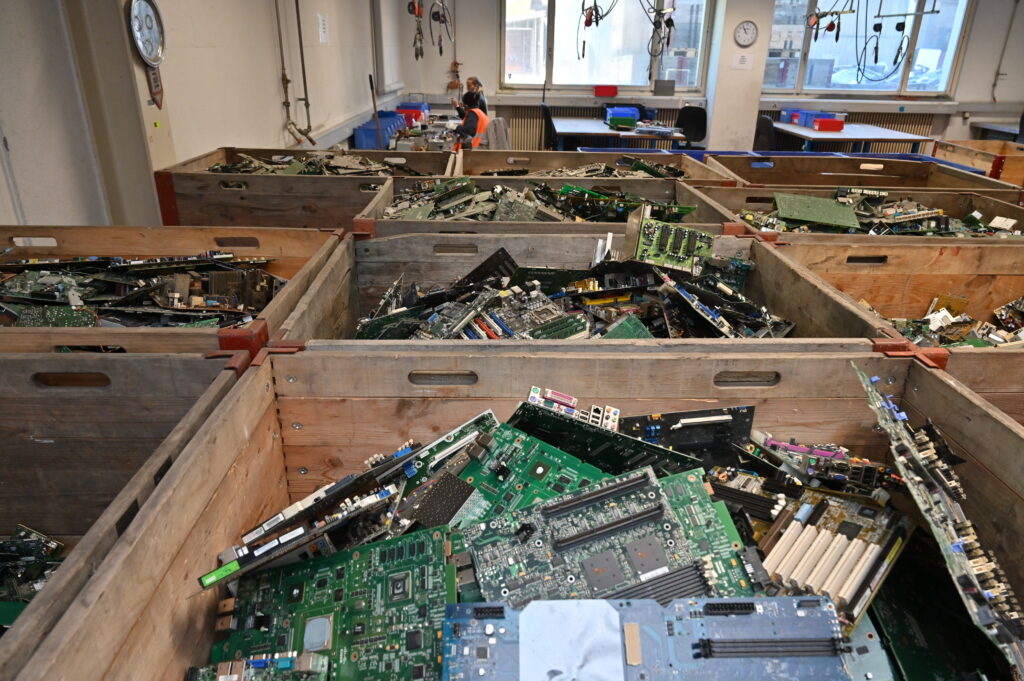 Im Raum gibt es verschiedene Arbeitsplätze ausgerüstet mit Tisch, Stuhl und jede Menge Werkzeug. Dazwischen stehen Rahmenpaletten mit ganzen PCs und Laptops aber auch bereits ausgebauten Einzelteilen. Auch hier geschieht alles in Handarbeit.