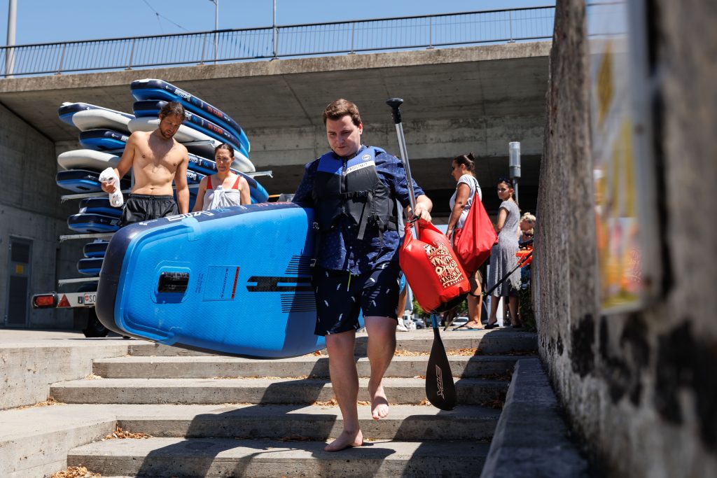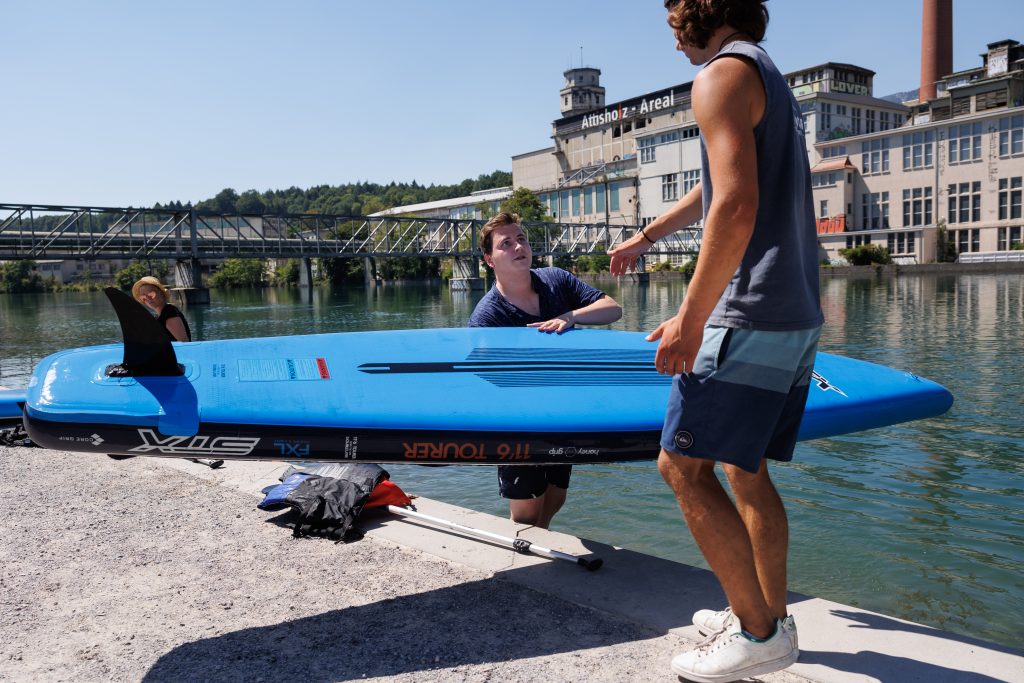 Bei der «1881 Kantine» drehten wir unsere SUPs mit der Spitze gegen den Strom, um mehr Kontrolle zu haben, und stiegen schliesslich bequem an Land. Dort angekommen, konnte ich mein Brett abgeben.