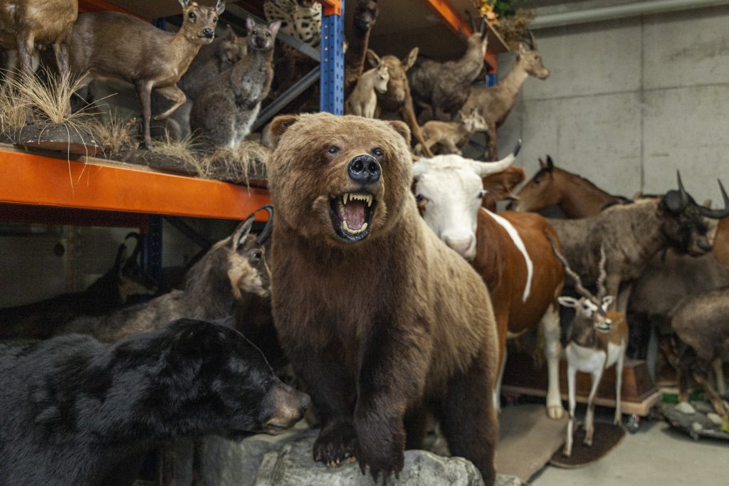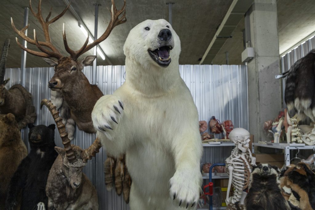 In einem unscheinbaren Industriequartier in Würenlos deutet nichts darauf hin, dass sich hier Tausende Tiere tummeln. Doch nach der Fahrt mit dem Aufzug in den Keller kommt die Überraschung: Im Eingang zu einem Kellerabteil steht ein gewaltiger Eisbär mit der Tatze zum Hieb erhoben.