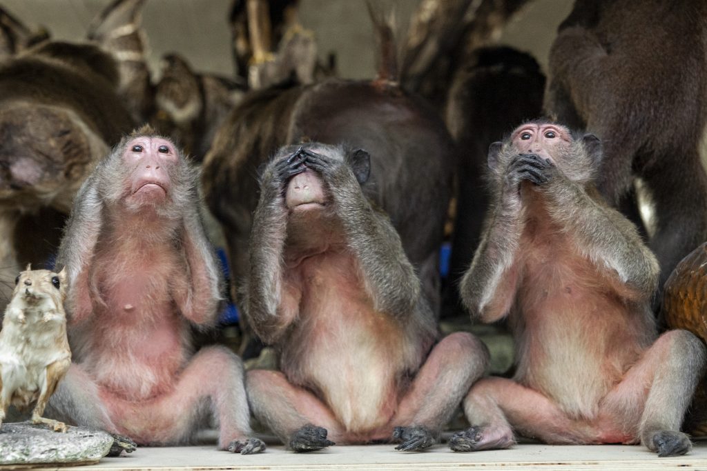 Wichtig sei Benz dabei stets der Respekt vor den Tieren: «Alle diese Tiere waren vorher lebendig und haben noch immer Respekt verdient», sagt er. Auch bei der Vermietung wisse er jeweils genau, wo das Tier hinkomme. Ausserdem unterliegen die Kundinnen und Kunden einer Sorgfaltspflicht. Wieder fällt auf: Drei Affen sitzen, einem japanischen Sprichwort entsprungen, auf dem Regal und halten sich Ohren, Augen und Mund zu.